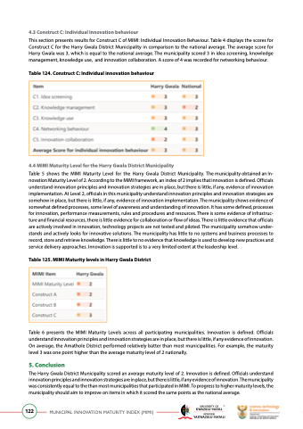 This section presents results for Construct C of MIMI: Individual Innovation Behaviour. Table 4 displays the scores for Construct C for the Harry Gwala District Municipality in comparison to the national average. The average score for Harry Gwala was 3, which is equal to the national average. The municipality scored 3 in idea screening, knowledge management, knowledge use, and innovation collaboration. A score of 4 was recorded for networking behaviour.