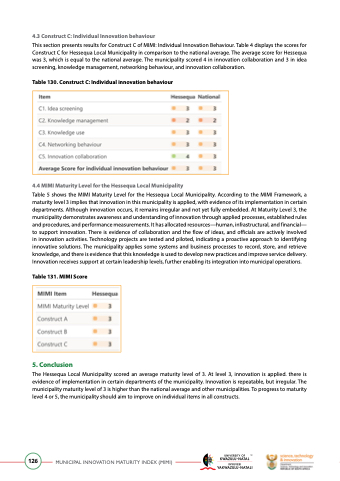 The Hessequa Local Municipality scored an average maturity level of 3. At level 3, innovation is applied. there is evidence of implementation in certain departments of the municipality. Innovation is repeatable, but irregular. The municipality maturity level of 3 is higher than the national average and other municipalities. To progress to maturity level 4 or 5, the municipality should aim to improve on individual items in all constructs.