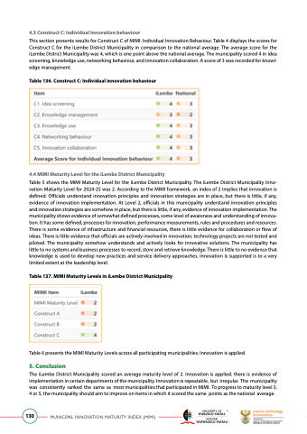 This section presents results for Construct C of MIMI: Individual Innovation Behaviour. Table 4 displays the scores for Construct C for the iLembe District Municipality in comparison to the national average. The average score for the iLembe District Municipality was 4, which is one point above the national average. The municipality scored 4 in idea screening, knowledge use, networking behaviour, and innovation collaboration. A score of 3 was recorded for knowl- edge management.