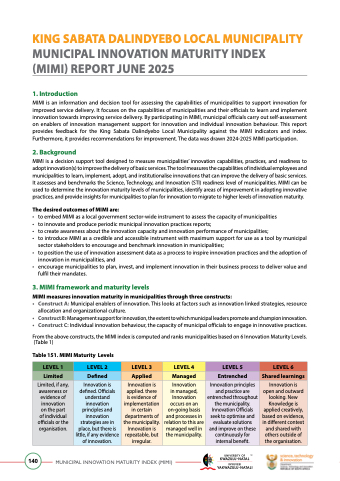 MIMI is an information and decision tool for assessing the capabilities of municipalities to support innovation for improved service delivery. It focuses on the capabilities of municipalities and their officials to learn and implement innovation towards improving service delivery. By participating in MIMI, municipal officials carry out self-assessment on enablers of innovation management support for innovation and individual innovation behaviour. This report provides feedback for the King Sabata Dalindyebo Local Municipality against the MIMI indicators and index. Furthermore, it provides recommendations for improvement. The data was drawn 2024-2025 MIMI participation.