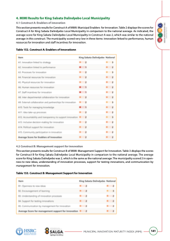 This section presents results for Construct B of MIMI: Management Support for Innovation. Table 3 displays the scores for Construct B for King Sabata Dalindyebo Local Municipality in comparison to the national average. The average score for King Sabata Dalindyebo was 2, which is the same as the national average. The municipality scored 2 in open- ness to new ideas, understanding of innovation processes, support for testing innovations, and communication by management for innovation.