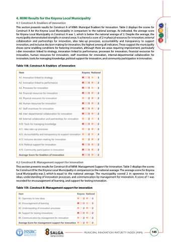 This section presents results for Construct A of MIMI: Municipal Enablers for Innovation. Table 2 displays the scores for Construct A for the Knysna Local Municipality in comparison to the national average. As indicated, the average score for Knysna Local Municipality in Construct A was 1, which is below the national average of 2. Despite the average, the municipality demonstrated strengths in several areas. It achieved a score of 2 in physical resources for innovation, external collaboration and partnerships for innovation, idea take-up processes, accountability and transparency to support innovation, and inclusive decision-making for innovation, the highest among all indicators. These suggest the municipality shows some enabling conditions for fostering innovation, although there are areas requiring improvement, particularly i-den innovation linked to strategy, innovation linked to performance, processes for innovation, financial resources for innovation, human resources for innovation, staff incentives for innovation, internal-departmental collaboration for innovation, tools for managing knowledge, political support for innovation, and community participation in innovation.