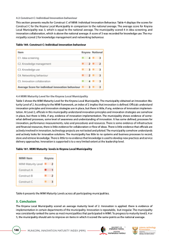 This section presents results for Construct C of MIMI: Individual Innovation Behaviour. Table 4 displays the scores for Construct C for the Knysna Local Municipality in comparison to the national average. The average score for Knysna Local Municipality was 3, which is equal to the national average. The municipality scored 4 in idea screening, and innovation collaboration, which is above the national average. A score of 3 was recorded for knowledge use. The mu- nicipality scored 2 for knowledge management and networking behaviour.