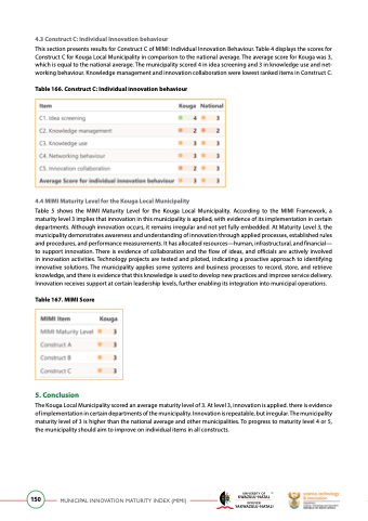 The Kouga Local Municipality scored an average maturity level of 3. At level 3, innovation is applied. there is evidence of implementation in certain departments of the municipality. Innovation is repeatable, but irregular. The municipality maturity level of 3 is higher than the national average and other municipalities. To progress to maturity level 4 or 5, the municipality should aim to improve on individual items in all constructs.