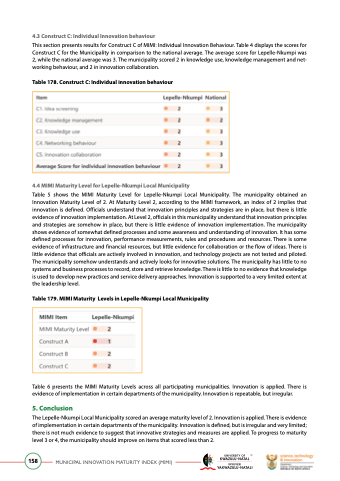 This section presents results for Construct C of MIMI: Individual Innovation Behaviour. Table 4 displays the scores for Construct C for the Municipality in comparison to the national average. The average score for Lepelle-Nkumpi was 2, while the national average was 3. The municipality scored 2 in knowledge use, knowledge management and net- working behaviour, and 2 in innovation collaboration.