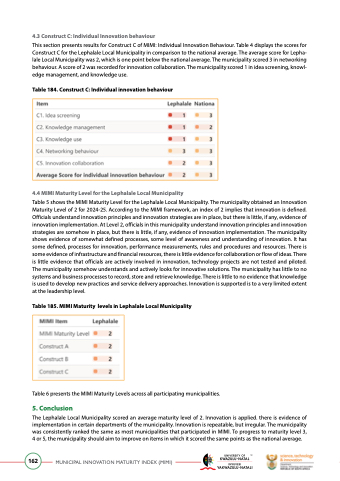 This section presents results for Construct C of MIMI: Individual Innovation Behaviour. Table 4 displays the scores for Construct C for the Lephalale Local Municipality in comparison to the national average. The average score for Lepha- lale Local Municipality was 2, which is one point below the national average. The municipality scored 3 in networking behaviour. A score of 2 was recorded for innovation collaboration. The municipality scored 1 in idea screening, knowl- edge management, and knowledge use.
