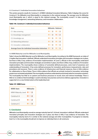 Mbhashe Local Municipality scored an average maturity level of 2. At level, innovation is defined. Officials understand innovation principles and innovation strategies are in place, but there is little, if any evidence of innovation. The municipality maturity level of 2 is similar to the national average and other municipalities. To progress to maturity level 4 or 5, the municipality should aim to improve on individual items in all constructs.