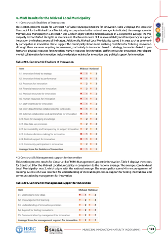 This section presents results for Construct A of MIMI: Municipal Enablers for Innovation. Table 2 displays the scores for Construct A for the Midvaal Local Municipality in comparison to the national average. As indicated, the average score for Midvaal Local Municipality in Construct A was 2, which aligns with the national average of 2. Despite the average, the mu- nicipality demonstrated strengths in several areas. It achieved a score of 4 in accountability and transparency to support innovation the highest among all indicators. Additionally, Midvaal Local Municipality scored 3 in areas such as communi- ty participation in innovation. These suggest the municipality shows some enabling conditions for fostering innovation, although there are areas requiring improvement, particularly in innovation linked to strategy, innovation linked to per- formance, physical resources for innovation, human resources for innovation, staff incentives for innovation, inter-depart- mental collaboration for innovation, inclusive decision- making for innovation, and political support for innovation.