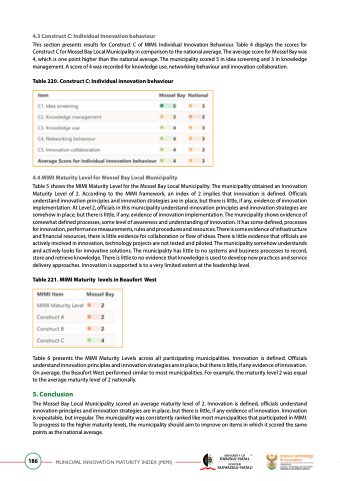 This section presents results for Construct C of MIMI: Individual Innovation Behaviour. Table 4 displays the scores for Construct C for Mossel Bay Local Municipality in comparison to the national average. The average score for Mossel Bay was 4, which is one point higher than the national average. The municipality scored 5 in idea screening and 3 in knowledge management. A score of 4 was recorded for knowledge use, networking behaviour and innovation collaboration.