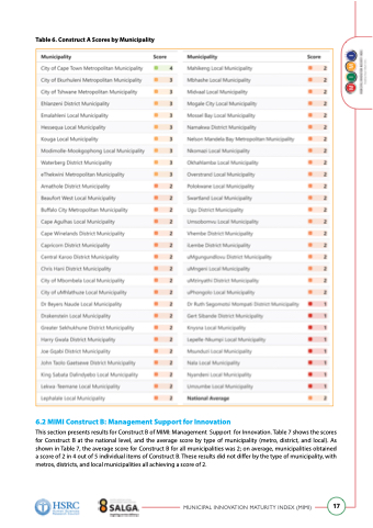 This section presents results for Construct B of MIMI: Management Support for Innovation. Table 7 shows the scores for Construct B at the national level, and the average score by type of municipality (metro, district, and local). As shown in Table 7, the average score for Construct B for all municipalities was 2; on average, municipalities obtained a score of 2 in 4 out of 5 individual items of Construct B. These results did not differ by the type of municipality, with metros, districts, and local municipalities all achieving a score of 2.