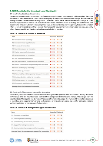 This section presents results for Construct A of MIMI: Municipal Enablers for Innovation. Table 2 displays the scores for Construct A for the Msunduzi Local District Municipality in comparison to the national average. As indicated, the average score for Msunduzi Local Municipality in Construct A was 1, which is below the national average of 2. The municipality achieved the score of 1 in several indicators except innovation linked to strategy and performance, staff incentives for innovation, tools for managing knowledge, and accountability and transparency to support innovation where a score of 2 was achieved. These suggest the municipality require improvement across several areas, especially where they achieved lower than the national average to foster innovation.