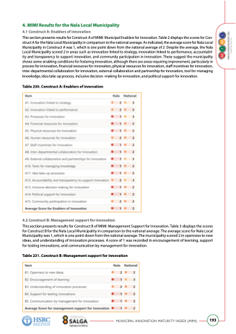 This section presents results for Construct A of MIMI: Municipal Enablers for Innovation. Table 2 displays the scores for Con- struct A for the Nala Local Municipality in comparison to the national average. As indicated, the average score for Nala Local Municipality in Construct A was 1, which is one point down from the national average of 2. Despite the average, the Nala Local Municipality scored 2 in areas such as innovation linked to strategy, innovation linked to performance, accountabil- ity and transparency to support innovation, and community participation in innovation. These suggest the municipality shows some enabling conditions for fostering innovation, although there are areas requiring improvement, particularly in process for innovation, financial resources for innovation, physical resources for innovation, staff incentives for innovation, inter-departmental collaboration for innovation, external collaboration and partnership for innovation, tool for managing knowledge, idea take up process, inclusive decision -making for innovation, and political support for innovation.