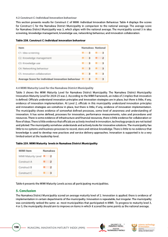 This section presents results for Construct C of MIMI: Individual Innovation Behaviour. Table 4 displays the scores for Construct C for the Namakwa District Municipality in comparison to the national average. The average score for Namakwa District Municipality was 3, which aligns with the national average. The municipality scored 3 in idea screening, knowledge management, knowledge use, networking behaviour, and innovation collaboration.