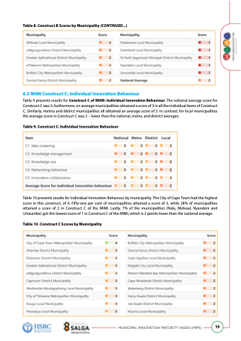 Table 9 presents results for Construct C of MIMI: Individual Innovation behaviour. The national average score for Construct C was 3; furthermore, on average municipalities obtained a score of 3 in all the individual items of Construct C. Similarly, metros and district municipalities all obtained an average score of 3. In contrast, for local municipalities the average score in Construct C was 2 – lower than the national, metro, and district averages.