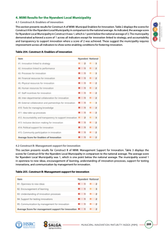This section presents results for Construct A of MIMI: Municipal Enablers for Innovation. Table 2 displays the scores for Construct A for the Nyandeni Local Municipality in comparison to the national average. As indicated, the average score for Nyandeni Local Municipality in Construct A was 1, which is 1 point below the national average of 2. The municipality demonstrated achieved a score of 1 across all indicators except for innovation linked to strategy, and accountability and transparency to support innovation where a score of 2 was achieved. These suggest the municipality requires improvement across all indicators to show some enabling conditions for fostering innovation.