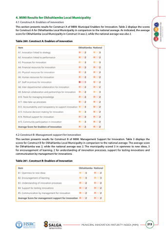 This section presents results for Construct A of MIMI: Municipal Enablers for Innovation. Table 2 displays the scores for Construct A for Okhahlamba Local Municipality in comparison to the national average. As indicated, the average score for Okhahlamba Local Municipality in Construct A was 2, while the national average was also 2.