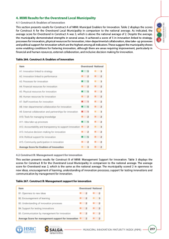 This section presents results for Construct A of MIMI: Municipal Enablers for Innovation. Table 2 displays the scores for Construct A for the Overstrand Local Municipality in comparison to the national average. As indicated, the average score for Overstrand in Construct A was 3, which is above the national average of 2. Despite the average, the municipality demonstrated strengths in several areas. It achieved a score of 5 in innovation linked to strategy, processes for innovation, physical resources for innovation, inter-departmental collaboration, idea take- up processes and political support for innovation which are the highest among all indicators. These suggest the municipality shows some enabling conditions for fostering innovation, although there are areas requiring improvement, particularly in financial and human resources, external collaboration, and inclusive decision making for innovation.