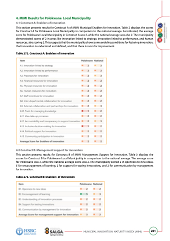 This section presents results for Construct A of MIMI: Municipal Enablers for Innovation. Table 2 displays the scores for Construct A for Polokwane Local Municipality in comparison to the national average. As indicated, the average score for Polokwane Local Municipality in Construct A was 2, while the national average was also 2. The municipality demonstrated scores of 2 in areas like innovation linked to strategy, innovation linked to performance, and human resources, also scoring 2. This suggests that the municipality shows some enabling conditions for fostering innovation, that innovation is understood and defined, and that there is room for improvement.