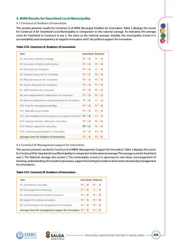 This section presents results for Construct A of MIMI: Municipal Enablers for Innovation. Table 2 displays the scores for Construct A for Swartland Local Municipality in comparison to the national average. As indicated, the average score for Swartland in Construct A was 2, the same as the national average. Notably, the municipality scored 6 in accountability and transparency to support innovation and 5 for political support for innovation.
