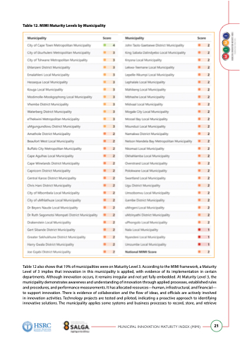 Table 12 also shows that 19% of municipalities were on Maturity Level 3. According to the MIMI framework, a Maturity Level of 3 implies that innovation in this municipality is applied, with evidence of its implementation in certain departments. Although innovation occurs, it remains irregular and not yet fully embedded. At Maturity Level 3, the municipality demonstrates awareness and understanding of innovation through applied processes, established rules and procedures, and performance measurements. It has allocated resources—human, infrastructural, and financial— to support innovation. There is evidence of collaboration and the flow of ideas, and officials are actively involved in innovation activities. Technology projects are tested and piloted, indicating a proactive approach to identifying innovative solutions. The municipality applies some systems and business processes to record, store, and retrieve