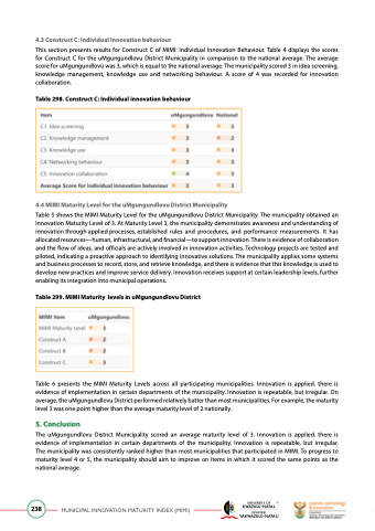 Table 6 presents the MIMI Maturity Levels across all participating municipalities. Innovation is applied. there is evidence of implementation in certain departments of the municipality. Innovation is repeatable, but irregular. On average, the uMgungundlovu District performed relatively batter than most municipalities. For example, the maturity level 3 was one point higher than the average maturity level of 2 nationally.