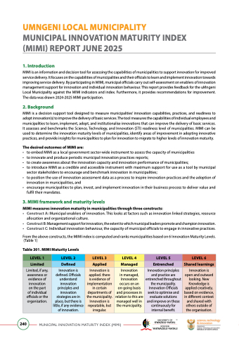 MIMI is an information and decision tool for assessing the capabilities of municipalities to support innovation for improved service delivery. It focuses on the capabilities of municipalities and their officials to learn and implement innovation towards improving service delivery. By participating in MIMI, municipal officials carry out self-assessment on enablers of innovation management support for innovation and individual innovation behaviour. This report provides feedback for the uMngeni Local Municipality against the MIMI indicators and index. Furthermore, it provides recommendations for improvement. The data was drawn 2024-2025 MIMI participation.
