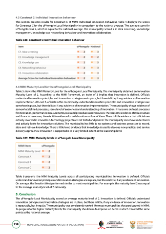 This section presents results for Construct C of MIMI: Individual Innovation Behaviour. Table 4 displays the scores for Construct C for the uPhongolo Local Municipality in comparison to the national average. The average score for uPhongolo was 2, which is equal to the national average. The municipality scored 2 in idea screening, knowledge management, knowledge use networking behaviour and innovation collaboration.