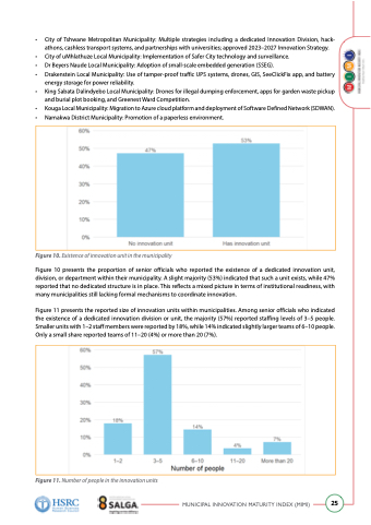 Figure 10 presents the proportion of senior officials who reported the existence of a dedicated innovation unit, division, or department within their municipality. A slight majority (53%) indicated that such a unit exists, while 47% reported that no dedicated structure is in place. This reflects a mixed picture in terms of institutional readiness, with many municipalities still lacking formal mechanisms to coordinate innovation.
