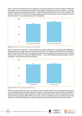 Figure 12 presents the proportion of senior officials who reported the presence of innovation champions within their municipality. Just over half (53%) indicated that their municipality has designated innovation champions – individuals tasked with promoting or facilitating innovation – while 47% reported that they do not have such champions. This reflects a modest level of institutional embedding, suggesting that while innovation may be recognised, the formal role of champions is not yet widespread across all municipalities.