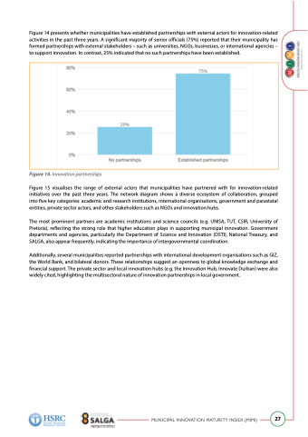 Figure 15 visualises the range of external actors that municipalities have partnered with for innovation-related initiatives over the past three years. The network diagram shows a diverse ecosystem of collaboration, grouped into five key categories: academic and research institutions, international organisations, government and parastatal entities, private sector actors, and other stakeholders such as NGOs and innovation hubs.