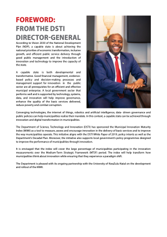 The Department of Science, Technology and Innovation (DSTI) has sponsored the Municipal Innovation Maturity Index (MIMI) as a tool to measure, assess and encourage innovation in the delivery of basic services and to improve the way municipalities operate. This initiative aligns with the DSTI White Paper of 2019, policy intents as well as the Department’s Decadal Plan. Moreover, the initiative also supports local government’s policy programmes designed to improve the performance of municipalities through innovation.