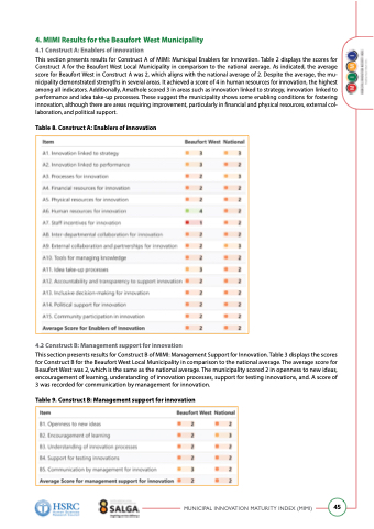 This section presents results for Construct A of MIMI: Municipal Enablers for Innovation. Table 2 displays the scores for Construct A for the Beaufort West Local Municipality in comparison to the national average. As indicated, the average score for Beaufort West in Construct A was 2, which aligns with the national average of 2. Despite the average, the mu- nicipality demonstrated strengths in several areas. It achieved a score of 4 in human resources for innovation, the highest among all indicators. Additionally, Amathole scored 3 in areas such as innovation linked to strategy, innovation linked to performance and idea take-up processes. These suggest the municipality shows some enabling conditions for fostering innovation, although there are areas requiring improvement, particularly in financial and physical resources, external col- laboration, and political support.