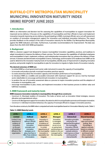 MIMI is an information and decision tool for assessing the capabilities of municipalities to support innovation for improved service delivery. It focuses on the capabilities of municipalities and their officials to learn and implement innovation towards improving service delivery. By participating in MIMI, municipal officials carry out self-assessment on enablers of innovation management support for innovation and individual innovation behaviour. This report provides feedback on the analysis of the state of innovation maturity for the Buffalo City Metropolitan Municipality against the MIMI indicators and index. Furthermore, it provides recommendations for improvement. The data was drawn from the 2024-2025 MIMI participation.