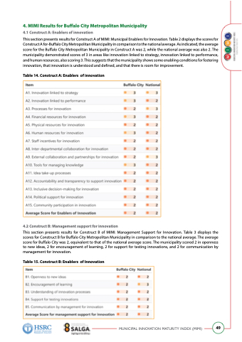 This section presents results for Construct A of MIMI: Municipal Enablers for Innovation. Table 2 displays the scores for Construct A for-Buffalo City Metropolitan Municipality in comparison to the national average. As indicated, the average score for the Buffalo City Metropolitan Municipality in Construct A was 2, while the national average was also 2. The municipality demonstrated scores of 3 in areas like innovation linked to strategy, innovation linked to performance, and human resources, also scoring 3. This suggests that the municipality shows some enabling conditions for fostering innovation, that innovation is understood and defined, and that there is room for improvement.