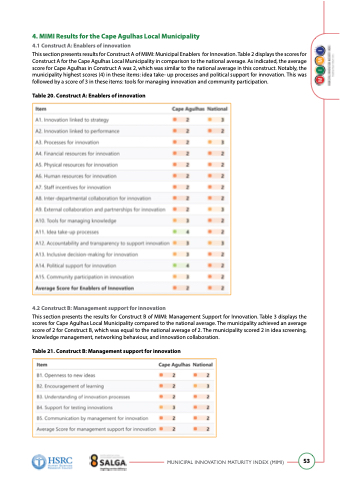 This section presents results for Construct A of MIMI: Municipal Enablers for Innovation. Table 2 displays the scores for Construct A for the Cape Agulhas Local Municipality in comparison to the national average. As indicated, the average score for Cape Agulhas in Construct A was 2, which was similar to the national average in this construct. Notably, the municipality highest scores (4) in these items: idea take- up processes and political support for innovation. This was followed by a score of 3 in these items: tools for managing innovation and community participation.