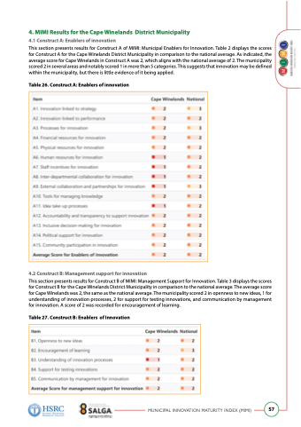 This section presents results for Construct B of MIMI: Management Support for Innovation. Table 3 displays the scores for Construct B for the Cape Winelands District Municipality in comparison to the national average. The average score for Cape Winelands was 2, the same as the national average. The municipality scored 2 in openness to new ideas, 1 for understanding of innovation processes, 2 for support for testing innovations, and communication by management for innovation. A score of 2 was recorded for encouragement of learning.