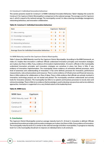 The Capricorn District Municipality scored an average maturity level of 2. At level 2, innovation is defined. Officials understand innovation principles and innovation strategies are in place, but there is little, if any evidence of innovation. The municipality maturity level of 2 is similar to the national average and other municipalities. To progress to maturity level 4 or 5, the municipality should aim to improve on individual items in all constructs.