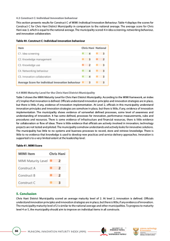This section presents results for Construct C of MIMI: Individual Innovation Behaviour. Table 4 displays the scores for Construct C for Chris Hani District Municipality in comparison to the national average. The average score for Chris Hani was 3, which is equal to the national average. The municipality scored 4 in idea screening, networking behaviour, and innovation collaboration.