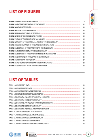 table 1. mimi maturity levels 10 table 2. mimi ParticiPation rate 11 table 3. mimi ParticiPation rate by Province 12 table 4. dePartment where oFFicials are based 14 table 5. construct a: enablers oF municiPal innovation 16 table 6. construct a scores by municiPality 17 table 7. construct b: management suPPort For innovation 18 table 8. construct b scores by municiPality 18 table 9. construct c: individual innovation behaviour 19 table 10. construct c scores by municiPality 19 table 11. mimi maturity levels at national level 20 table 12. mimi maturity levels by municiPality 21 table 13. mimi maturity levels by Province 22 table 14. mimi maturity levels by tyPe oF municiPality 23
