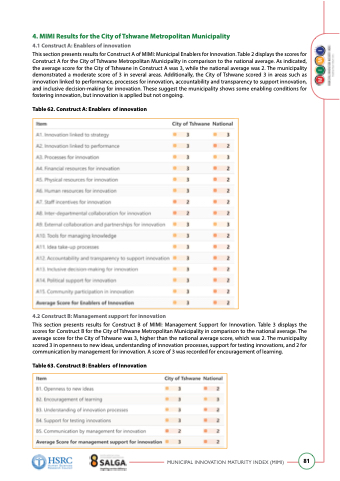 This section presents results for Construct A of MIMI: Municipal Enablers for Innovation. Table 2 displays the scores for Construct A for the City of Tshwane Metropolitan Municipality in comparison to the national average. As indicated, the average score for the City of Tshwane in Construct A was 3, while the national average was 2. The municipality demonstrated a moderate score of 3 in several areas. Additionally, the City of Tshwane scored 3 in areas such as innovation linked to performance, processes for innovation, accountability and transparency to support innovation, and inclusive decision-making for innovation. These suggest the municipality shows some enabling conditions for fostering innovation, but innovation is applied but not ongoing.