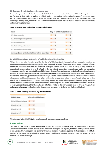 This section presents results for Construct C of MIMI: Individual Innovation Behaviour. Table 4 displays the scores for Construct C for the City of uMhlathuze Municipality in comparison to the national average. The average score for City of uMhlathuze was 2, which is one point lower than the national average. The municipality scored 2 in knowledge management, knowledge use and innovation collaboration. A score of 3 was recorded for idea screening and networking behaviour.