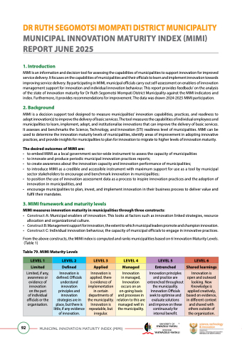 MIMI is an information and decision tool for assessing the capabilities of municipalities to support innovation for improved service delivery. It focuses on the capabilities of municipalities and their officials to learn and implement innovation towards improving service delivery. By participating in MIMI, municipal officials carry out self-assessment on enablers of innovation management support for innovation and individual innovation behaviour. This report provides feedback/ on the analysis of the state of innovation maturity for Dr Ruth Segomotsi Mompati District Municipality against the MIMI indicators and index. Furthermore, it provides recommendations for improvement. The data was drawn 2024-2025 MIMI participation.