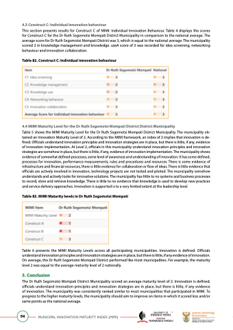 Table 6 presents the MIMI Maturity Levels across all participating municipalities. Innovation is defined. Officials understand innovation principles and innovation strategies are in place, but there is little, if any evidence of innovation. On average, the Dr Ruth Segomotsi Mompati District performed like most municipalities. For example, the maturity level 2 was equal to the average maturity level of 2 nationally.