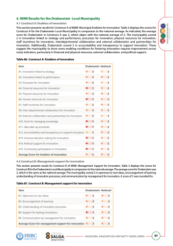 This section presents results for Construct B of MIMI: Management Support for Innovation. Table 3 displays the scores for Construct B for the Drakenstein Local Municipality in comparison to the national average. The average score for Drakenstein was 2, which is the same as the national average. The municipality scored 2 in openness to new ideas, encouragement of learning understanding of innovation processes, and communication by management for innovation. A score of 3 was recorded for.