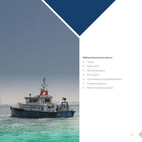 NSW provides services such as: • Towing • Vessel escort • Berthing assistance • Pilot support • Line handling services a oat & ashore • Emergency response • Marine maintenance support 14