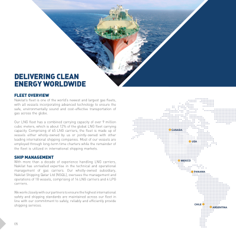 Nakilat’s eet is one of the world’s newest and largest gas eets, with all vessels incorporating advanced technology to ensure the safe, environmentally sound and cost-effective transportation of gas across the globe.