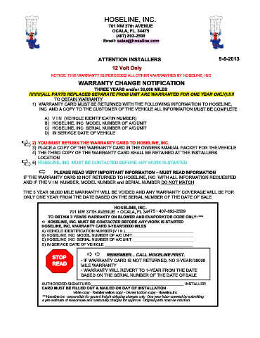 HOSELINE, INC. WARRANTY CARD 3-YEAR/36000 MILES