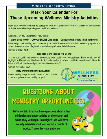 Mark your calendar and plan to participate with the Cornerstone Wellness Ministry in the following