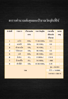 ตารางค านวณต้นทุนและปริมาณวัตถุดิบที่ใช้
