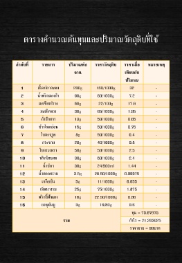 ตารางค านวณต้นทุนและปริมาณวัตถุดิบที่ใช้